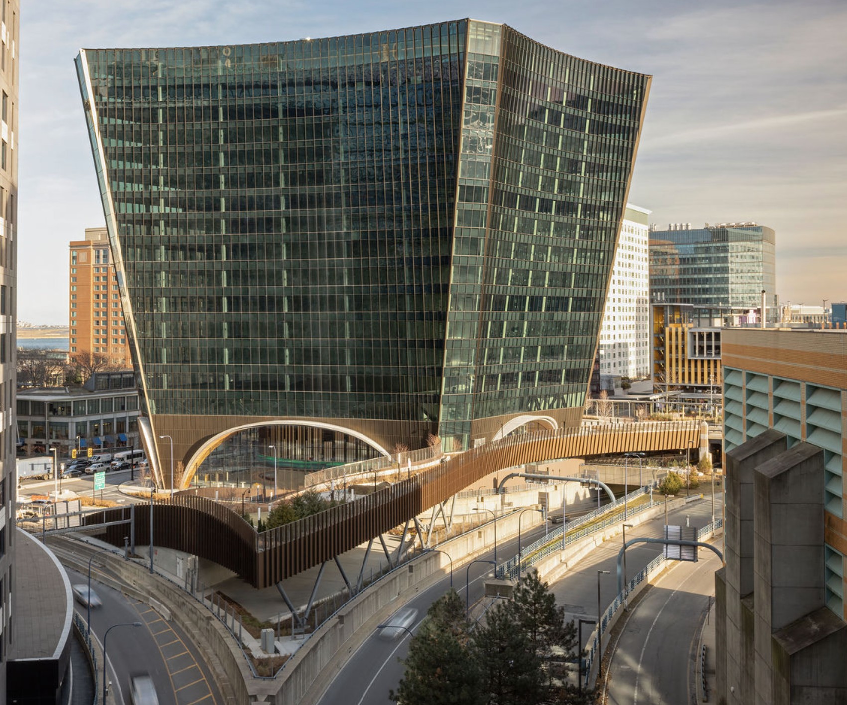 At Boston’s 10 World Trade development in the Seaport District, a distinctive pedestrian land bridge reconnects two parcels previously separated by Interstate-90 ramps. The bridge transforms what was once a transportation barrier into a continuous public landscape and pedestrian pathway, linking the surrounding streets, open space, and building frontage.