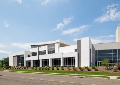 The Home2 Suites and Event Center is now the regional leader for events with expanded accommodations, including extended stay options. Located next to the Double Tree by Marriott (a 2012 Jersey Panel project) for the same client this hospitality campus is strategically located near Otis Elevator training center and the ESPN Headquarters in Bristol, CT. The Design Assist team worked together to bring a modern clean look to the hotel and event center while keeping some classic brick elements to tie the project to its neighboring hotel the Double Tree. The Feature Home2 beacon element was created with the Sto Ventec Glass rain screen cladding system which gave it a modern fresh and clean look with vibrant color and reflectivity.