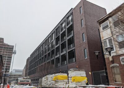 The Rutgers Honors Living-Learning Community (HLLC) on the Newark campus features a five-story, 330-space precast concrete parking garage. Located at 56 Summit St, this facility serves HLLC students, faculty, and partners. The garage main elevation was installed in 3 days with the prefabricated Sto Panels during a winter snow storm.
