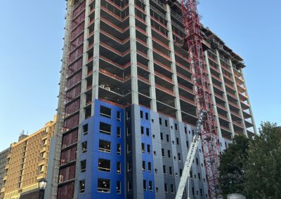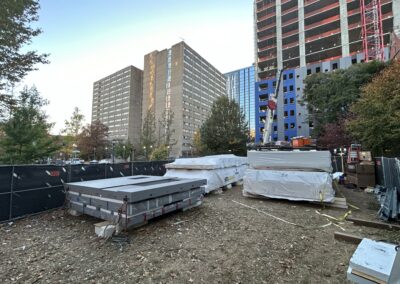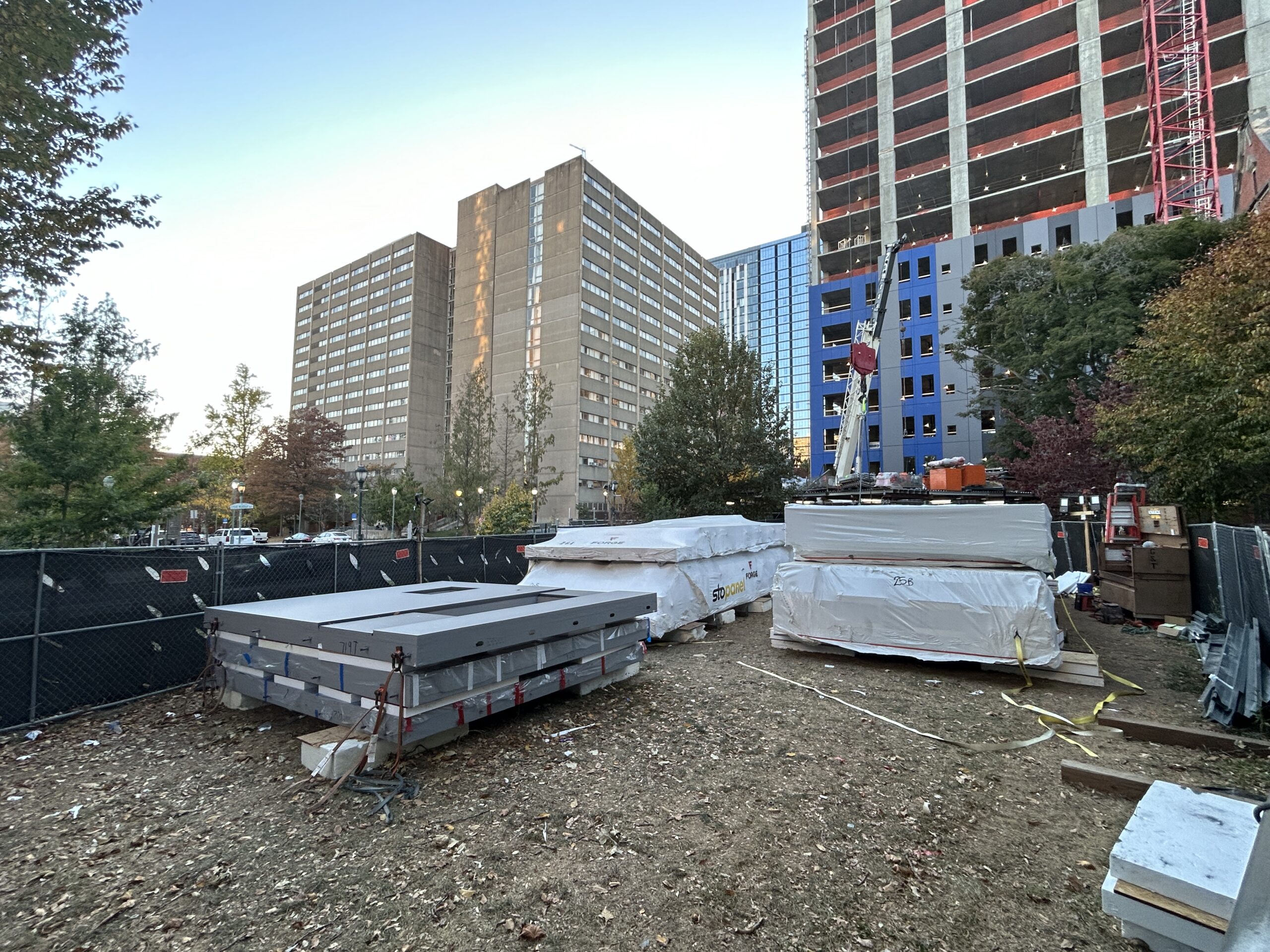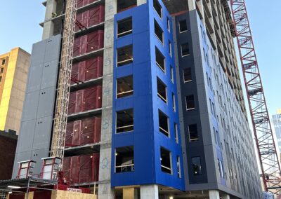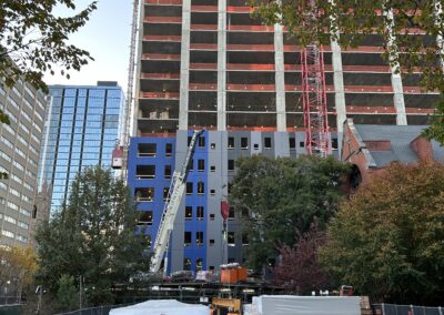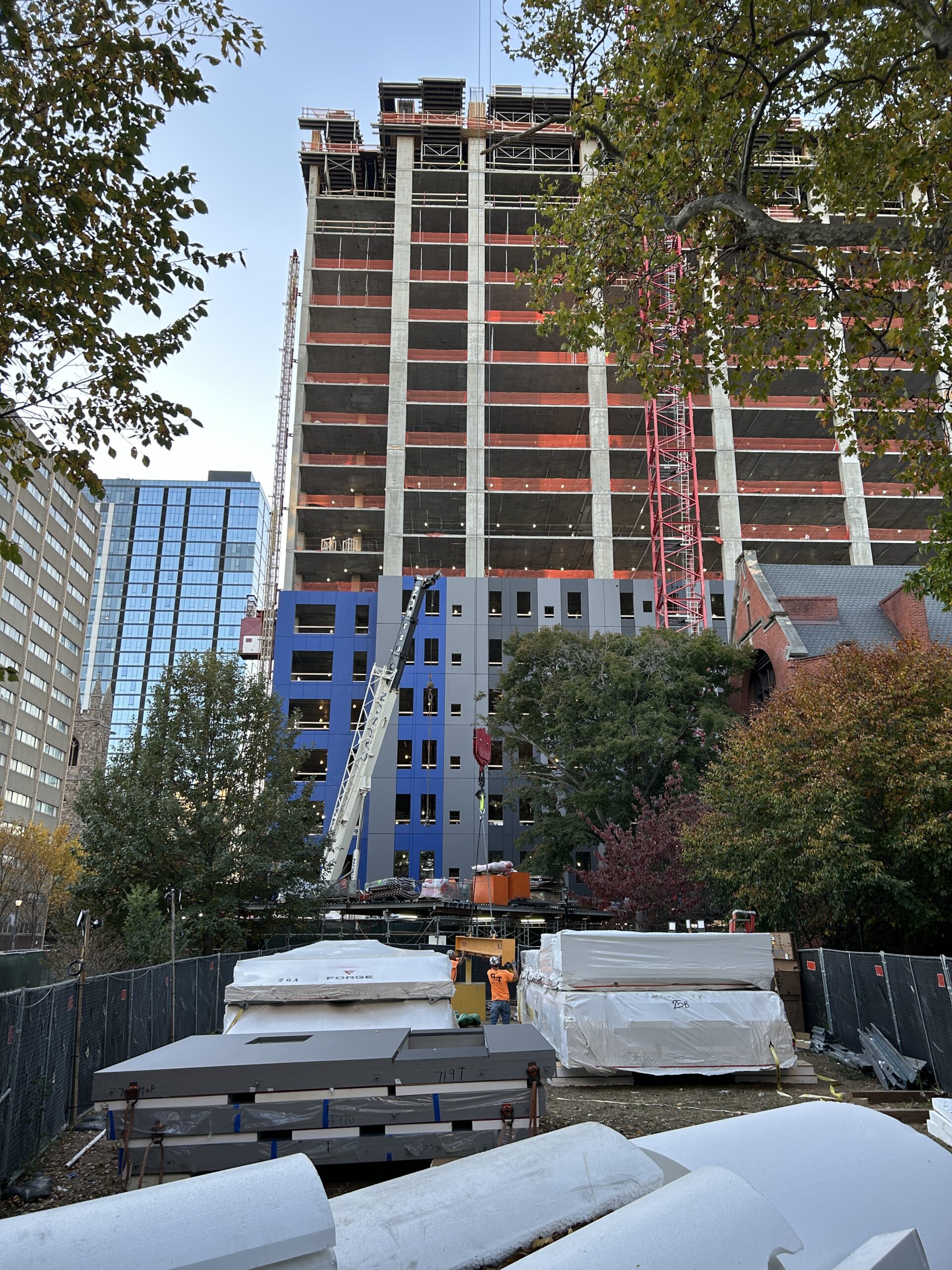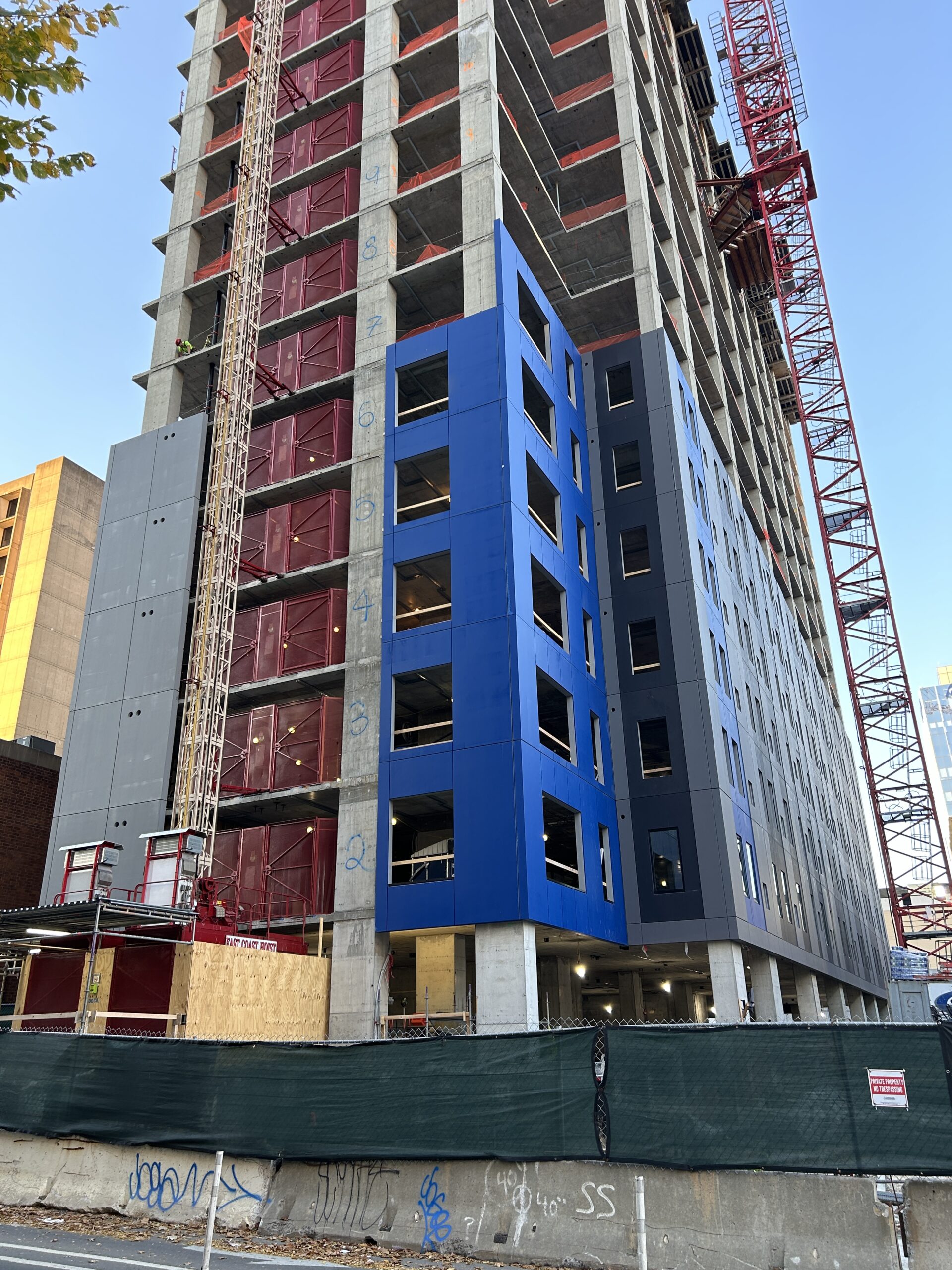 The Mark Philly is a high-end branded student housing apartment building located in west Philadelphia right between University of Pennsylvania and Drexel University on 37th and Chestnut streets. This project had a very tight jobsite with limited room for laydown of Sto Panels.  The team of Forge Co USA and Jersey Panel created a safe and productive process to rig and off-load an entire trailer bundle of panels with one pick and set it down on the jobsite for a second shift un-wrapping and panel installation.  The trailers of panels were unloaded in minutes after which the empty trailer left Chestnut street for minimal traffic interruption. If you have a tough jobsite and could benefit by shifting 80% of the labor and materials for the exterior wall off-site, we’d love to share with you our knowledge and be a service to your project.